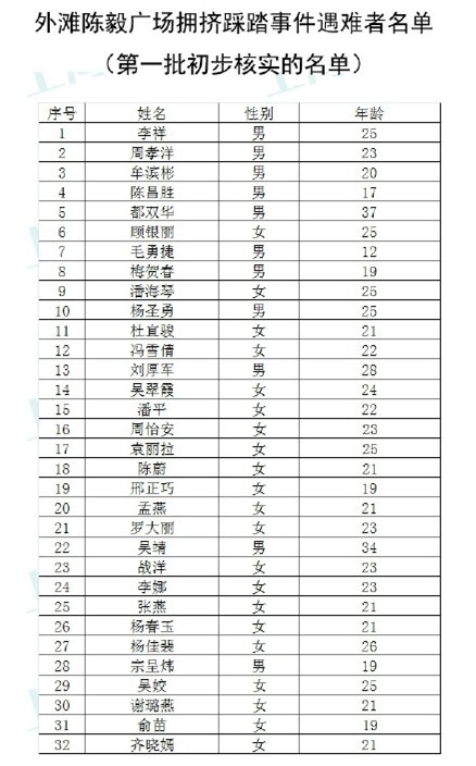 上海踩踏事件32位遇难者名单公布 平均年龄22岁(表)